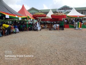 Madam Sylvia Appiah (District Extension Coordinator) introduced the chairperson of the occasion and also introduced other dignitaries. The chairperson then gave his acceptance speech and also expressed his gratitude for hosting the capital of the new cocoa district on his land.